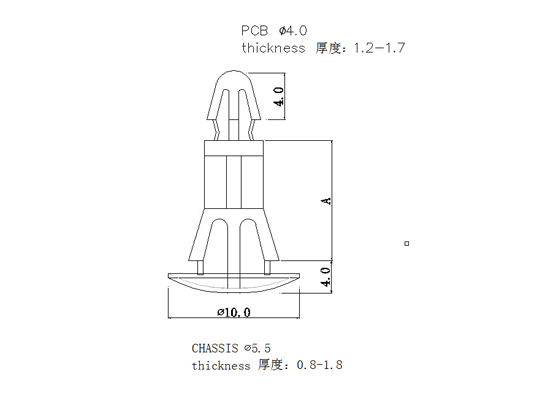 用途:一端固定機板上,另一端支撐PC板,避免下陷造成短路,PC板免鉆孔。