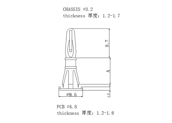 用途:一端固定機板上,另一端支撐PC板,避免下陷造成短路,PC板免鉆孔。